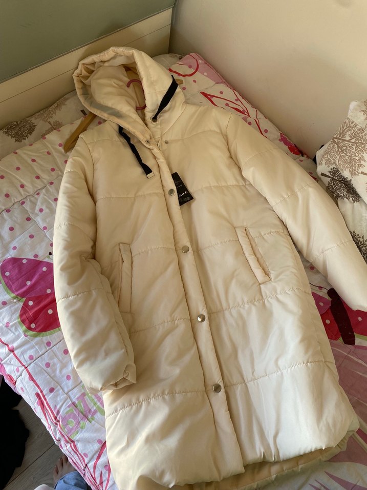 Düğmeli önü ve uzun kollu, yumuşak ve sıcak kumaştan beyaz kadın uzun kışlık mont. Notlu yaka ve rahat sokak stili ile günlük kullanıma uygun. ❄️