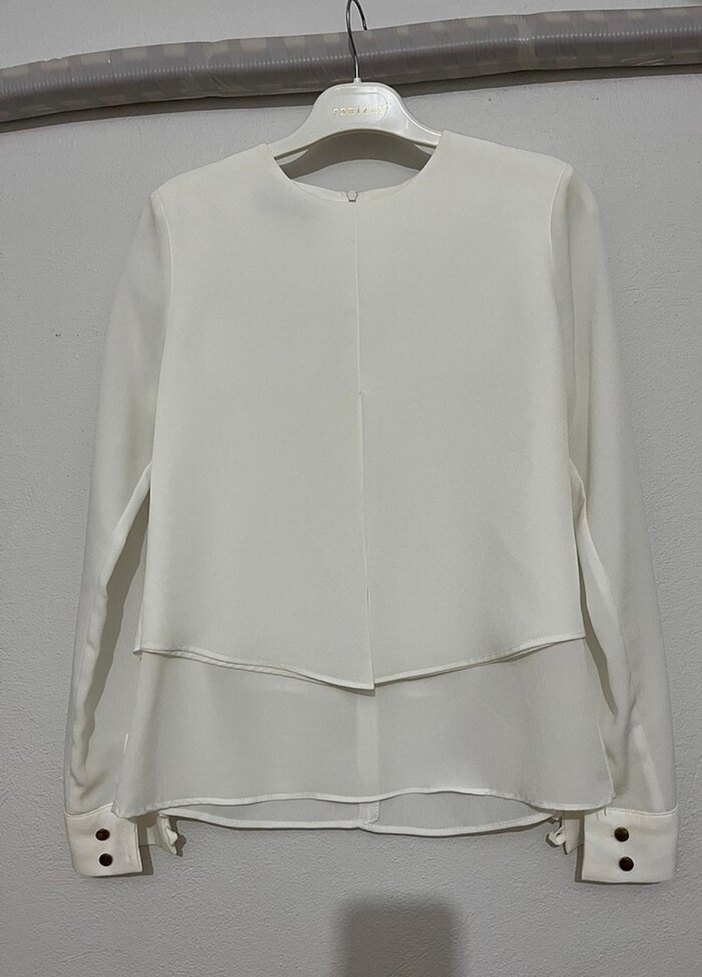 Düğmeli manşetli uzun kollu, yuvarlak yakalı beyaz bluz. Regular fit ve kısa boy, ofis için uygun, sentetik kumaştan yapılmıştır.