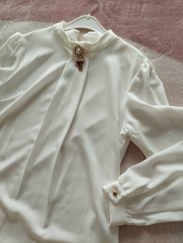 Beyaz, uzun kollu kadın gömleği, yüksek yakalı ve düğmeli detaylara sahiptir. İpeksi kumaştan üretilmiş, bol kesim ve modern klasik tarzıyla günlük kullanıma uygundur.