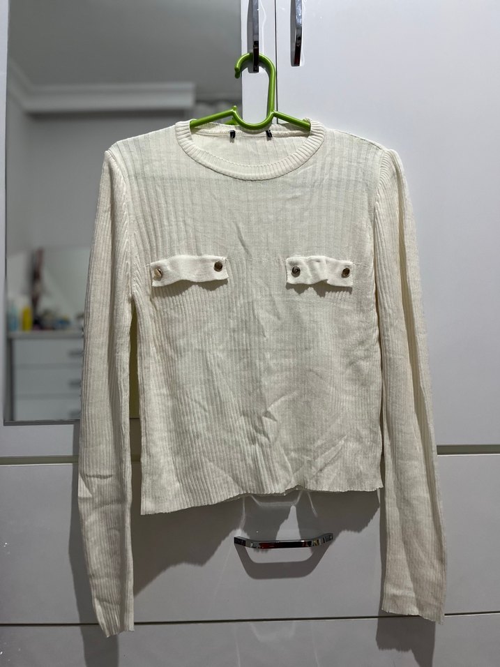 Pamuklu, düğmeli detaylı beyaz triko, uzun kollu ve normal boyda. Günlük sokak stiline uygun, trend bir görünüm sunar.