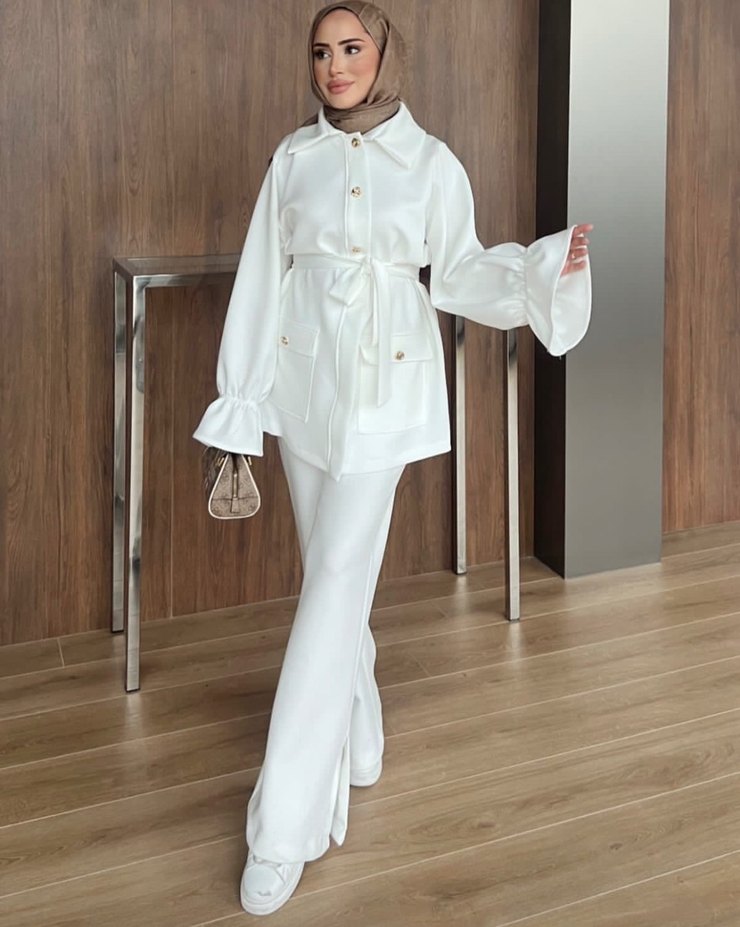Düğmeli Beyaz Kadın Uzun Takım Elbise
