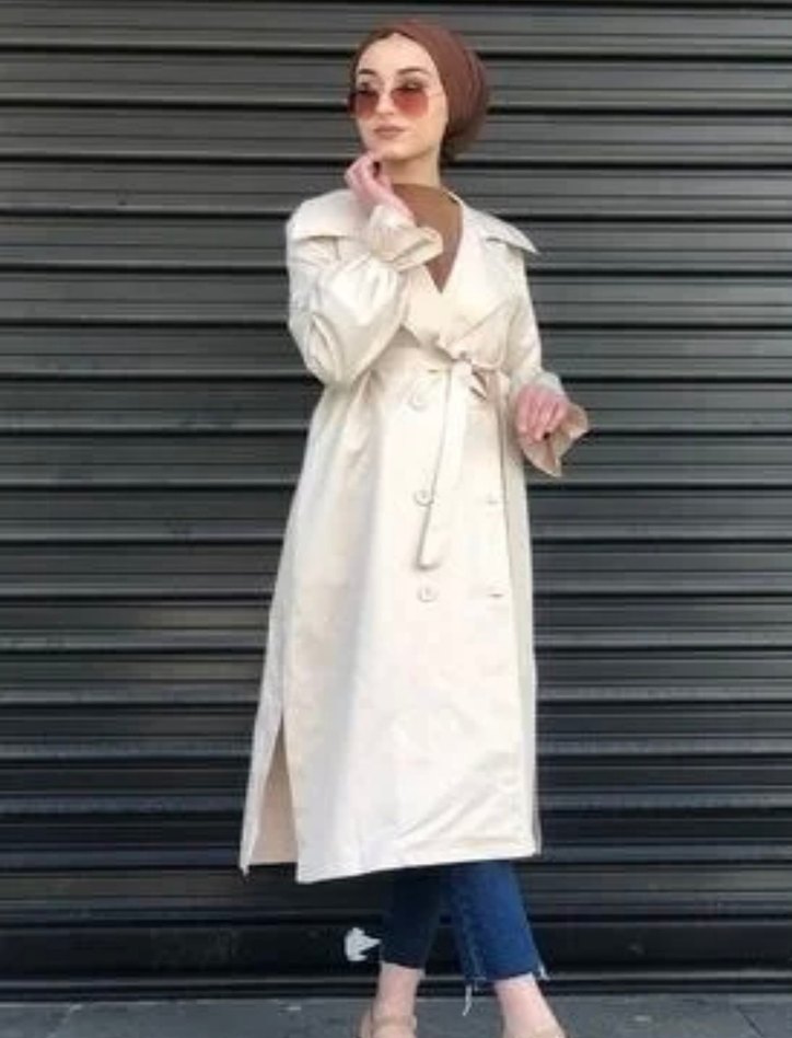 Düğmeli Beyaz Kadın Uzun Trençkot