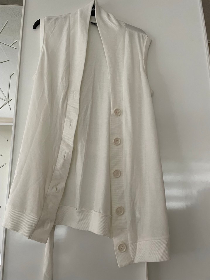 Düğmeli, notalı yaka detaylı, midi boy, normal kesim beyaz kadın yeleği. Ofis için uygun minimal ve normcore tarzda bir parça.