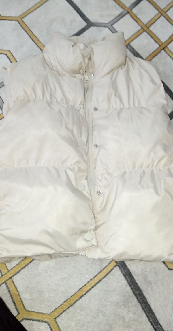 Düğmeli, yakalı beyaz kadın yelek. Yumuşak sentetik kumaştan, bol kesim ve normal boyda, günlük kullanıma uygun.