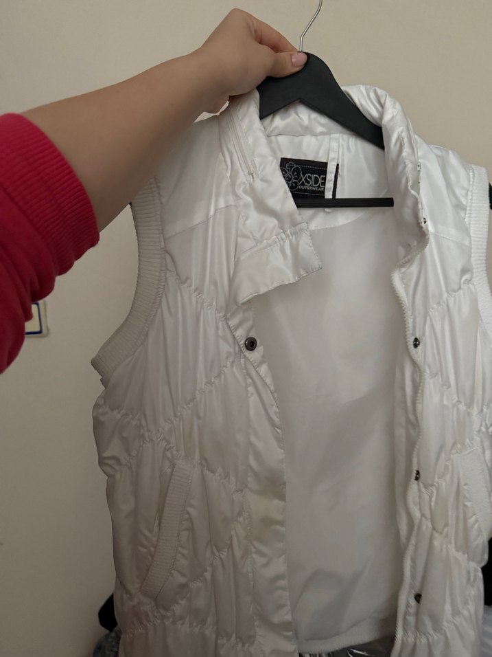 Düğmeli, yüksek yakalı beyaz kadın yelek. Pürüzsüz sentetik kumaştan, atletik sokak tarzı için uygun, vücuda oturan kesimde. Midi boyda ve desensiz.