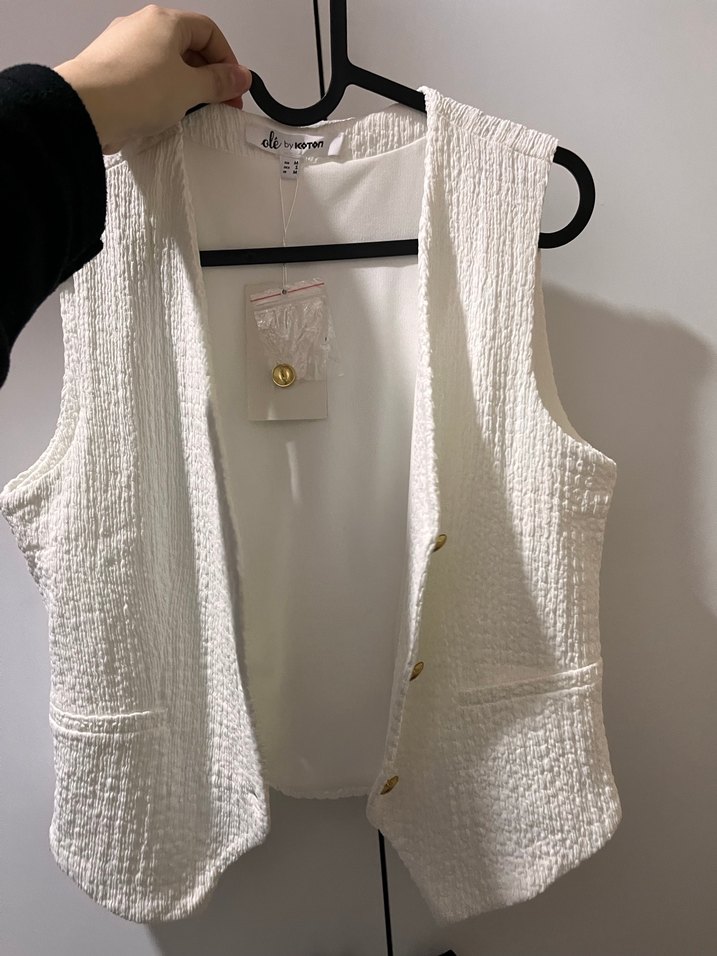 Düğmeli, beyaz, normal boyda, dar kesim kadın yelek. Günlük kullanıma uygun, şık ve rahat.