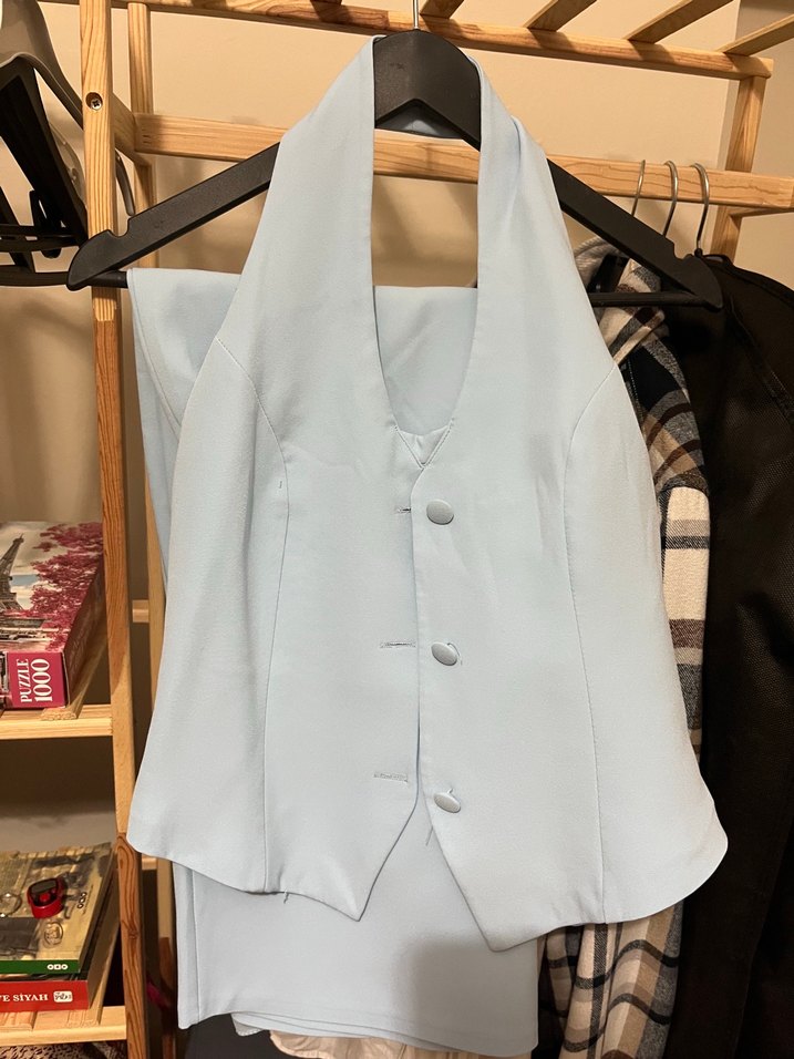 Düğmeli Beyaz Kadın Yelek Etek Takım