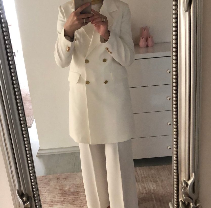 Düğmeli, normal uzunlukta beyaz blazer, klasik kesimde. Uzun kollu, ofis için ideal şık bir parça. Küçük bir kaç sarmaları var beyaz olduğu için dolapta durmaya bağlı yıkayınca cıkar büyük ihtimalle