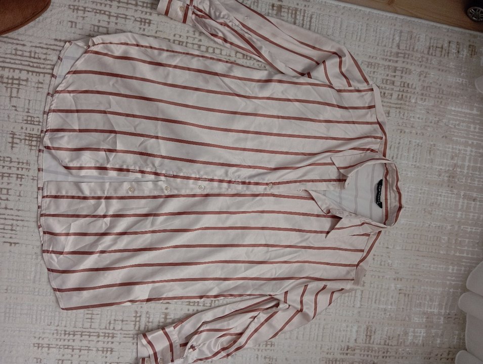 Beyaz ve kahve çizgili bu gömlek uzun kollu, düğmeli ve yakalıdır. Salaş kesimiyle rahattır. hiç giyilmedi sadece etiketi yok.lc Waikiki den aldım.