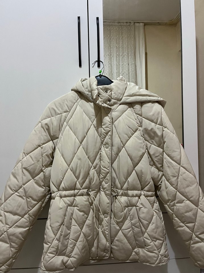 Düğmeli ön kısmı ve kapüşonlu, beyaz kapitone kadın ceket. Rahat ve şık sokak stili, kesimli ve askılı kollarıyla günlük kullanıma uygun.