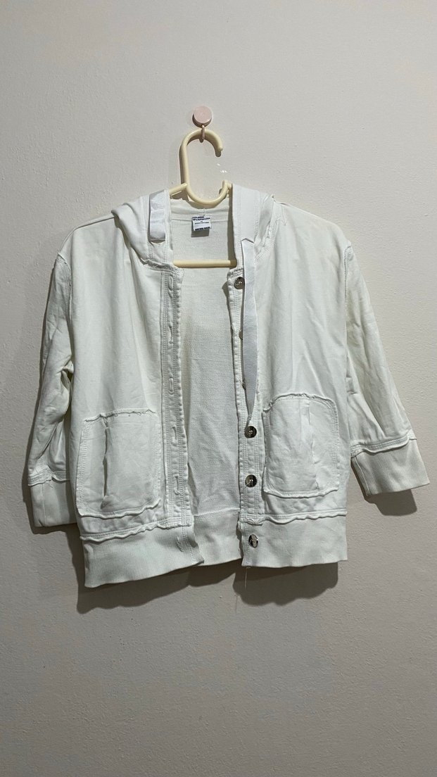 Düğmeli ve kapüşonlu, uzun kollu beyaz modal kumaş ceket. Rahat kesimi ve cepleriyle günlük sokak stiline uygundur. Fakir kol model. Yer yer lekeler oluşmuş valizde durmaktan, yıkanınca geçebilir, fiyatı uygun tutuyorum.