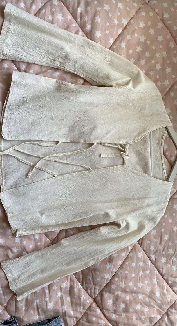 Düğmeli, V yakalı beyaz keten bluzu, bol kesim ve kollu Midi boyda, bohem tarzına uygun rahat bir model.