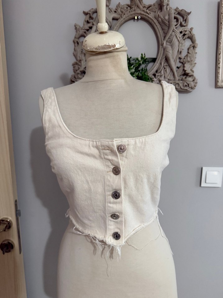 Bu beyaz keten büstiyer düğmeli ön kısmı, kare yaka ve kolsuz, bol kesimiyle vintage bohem tarzını yansıtıyor. Midi uzunlukta ve ham kenarlı, günlük kullanıma uygun.