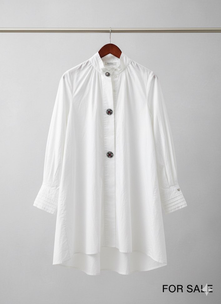 Uzun kollu, yüksek yakalı ve düğmeli beyaz gömlek iki kere giyildi salaş bir model Şule butik malıdır defosu yoktur temiz kullanılmıştır