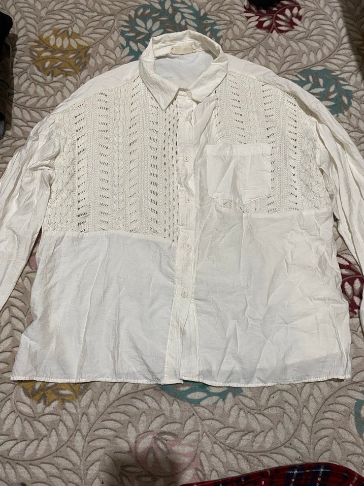 Beyaz keten gömlek, düğmeli ve uzun kolludur. Üst ön kısmında açık örgü detayları bulunur. Bol kesimi ve yakasıyla bohem tarzı sunar. Günlük kullanıma uygundur. Yeni urun hic giyilmedi ama alirken arka taraftaki ufak söküğü fark etmemisim ufak bi dikişle hallollur