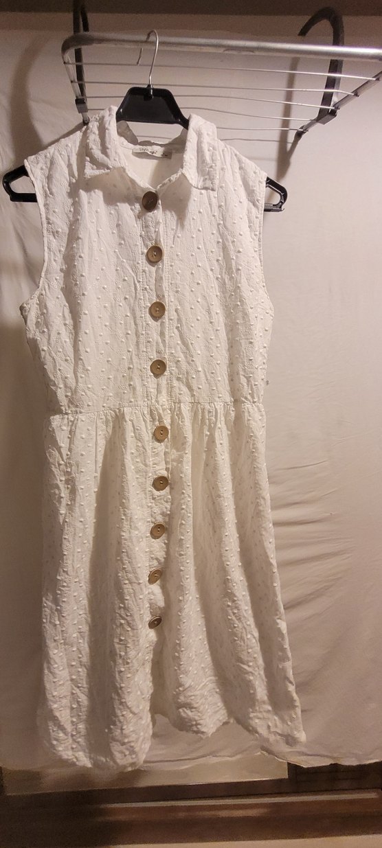 Beyaz keten, düğmeli, kolsuz, bol kesim ve V yakalı uzun elbise. Hafif kumaştan, bohem tarzda, günlük kullanıma uygun.
