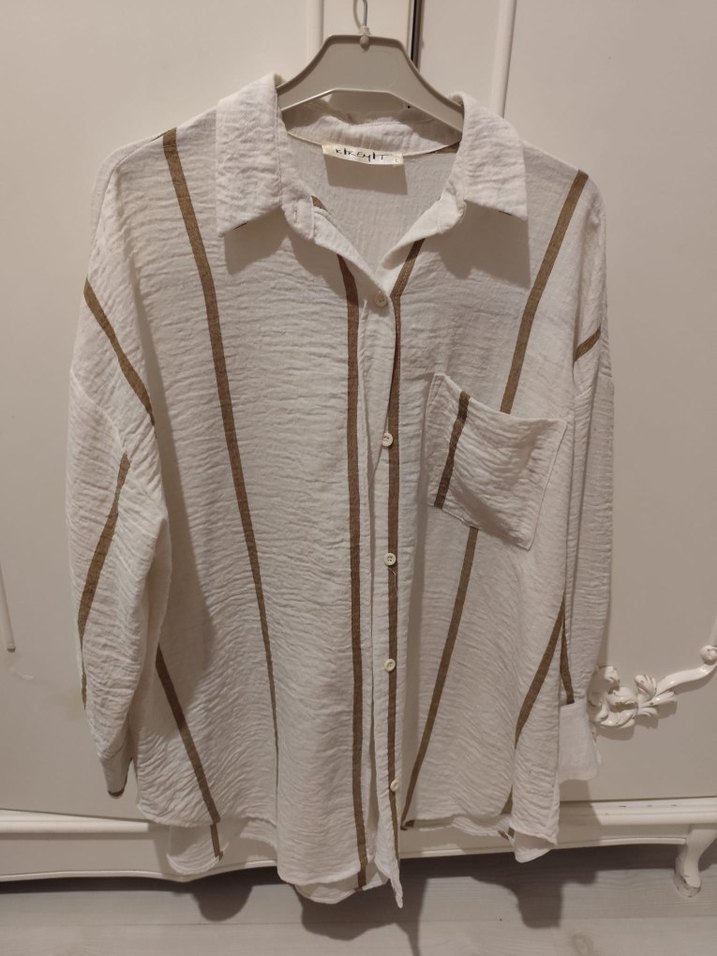 Beyaz keten gömlek, uzun kollu ve yakalıdır. Kahverengi ince çizgilerle desenlendirilmiş, düğmeli ve cep detaylıdır. Rahat kesimiyle günlük bohem tarz sunar.
