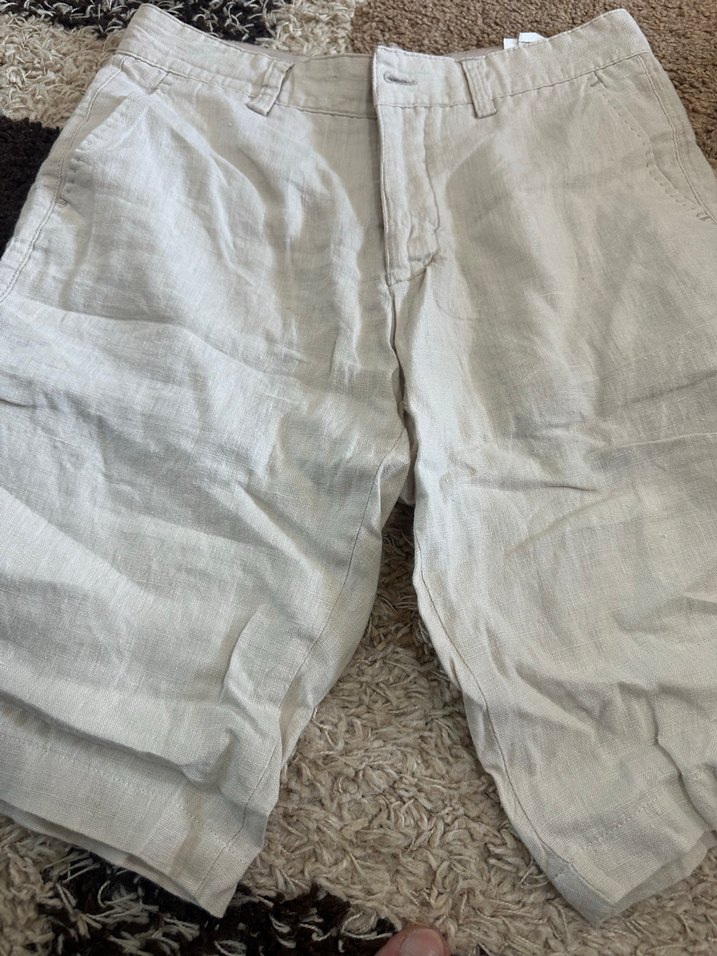 Düğmeli, normal boy, bol kesim beyaz keten erkek bermuda şort. Günlük sokak stili için rahat ve kullanışlı.