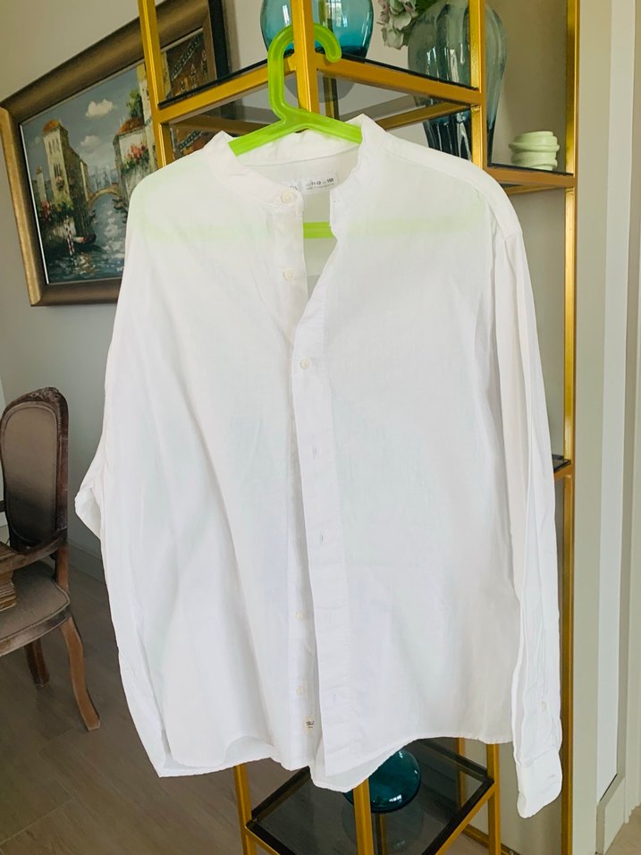 Düğmeli önü ve yakalı beyaz keten gömlek, uzun kollu ve bol kesim. Günlük kullanıma uygun rahat bir parça. Kullanılmamış ve sıfır ürün.