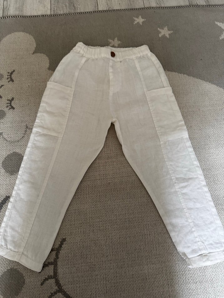 Düğmeli ve yan cepli beyaz keten bol kesim pantolon 4-5 yaş