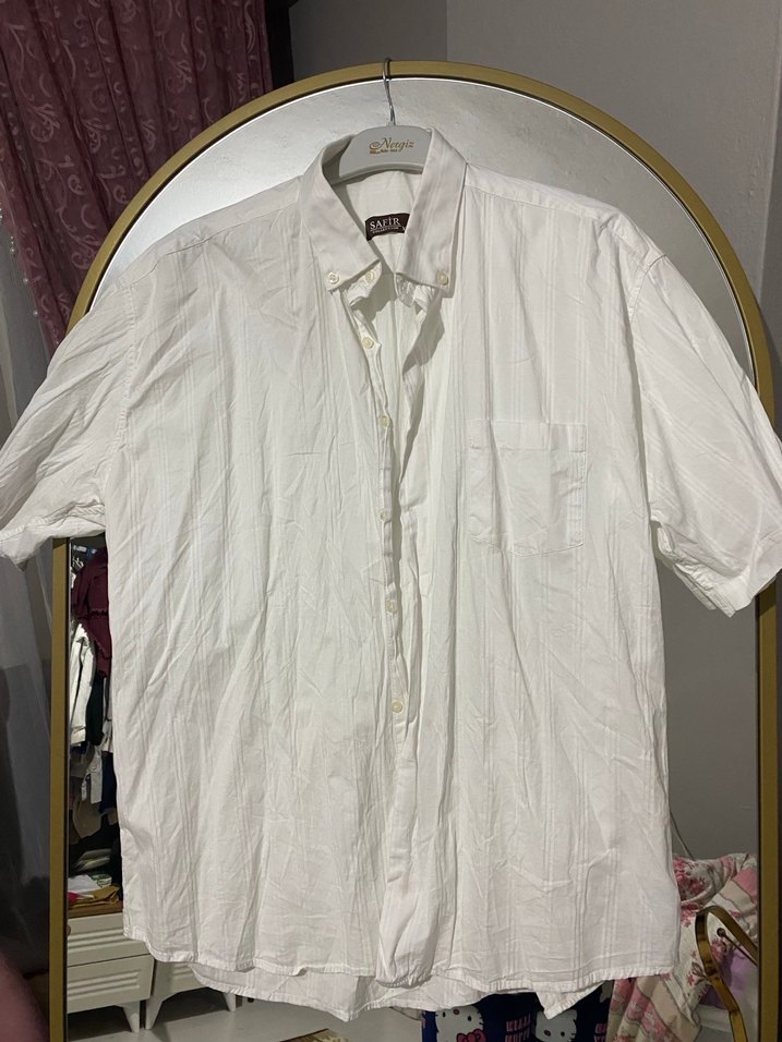 Bu beyaz keten erkek gömlek, kısa kollu, yakalı ve bol kesimdedir. Düğmeli önü ve parlak, desensiz kumaşıyla günlük rahat kullanıma uygundur.