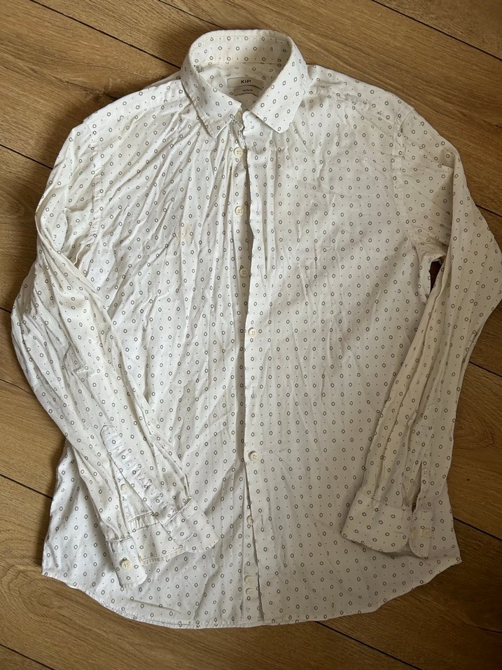 Uzun kollu, düğmeli ve yakalı beyaz keten erkek gömleği. Rahat kesim ve normal midi boyda, sade ve minimalist sokak stili için uygun. Önünde leke var