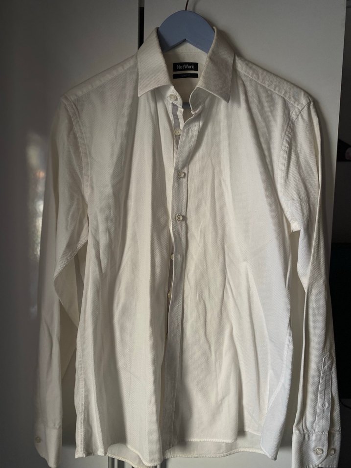Düğmeli ön kısmı ve uzun kollu, beyaz keten kumaştan yapılmış erkek gömleği. Normal kesim, ofis ve iş ortamları için uygundur.