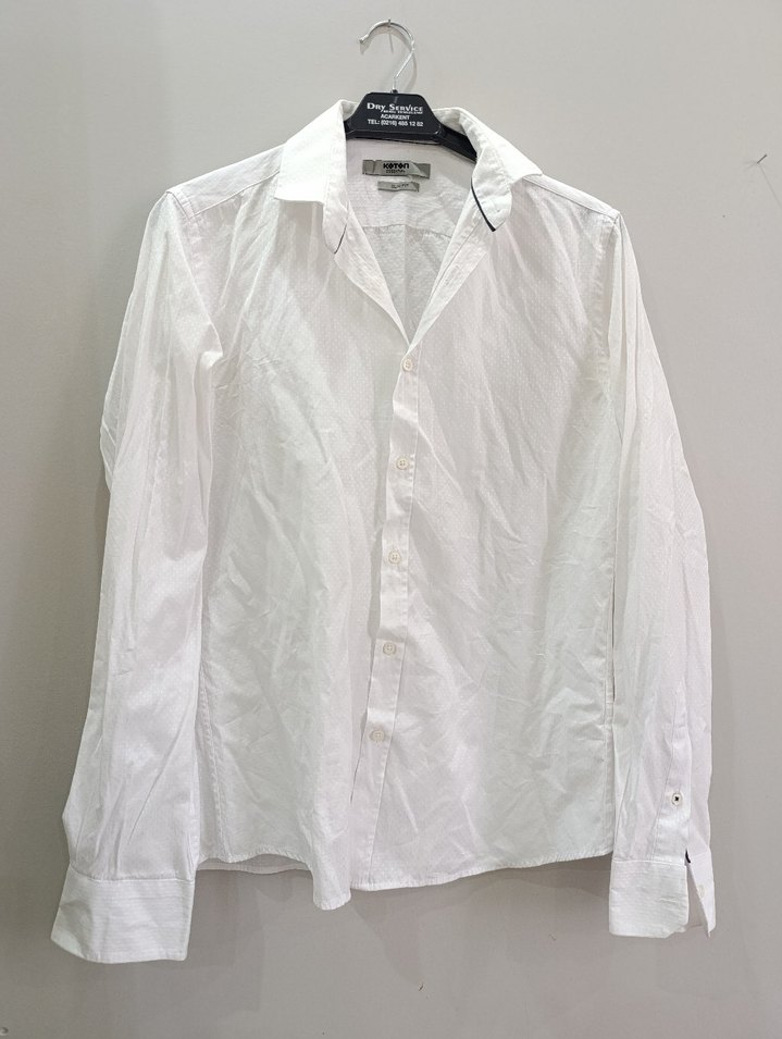 Düğmeli, beyaz keten erkek gömlek, yakalı ve uzun kolludur. Normal kesim ve parlak görünümlüdür, ofis kullanımı için uygundur.