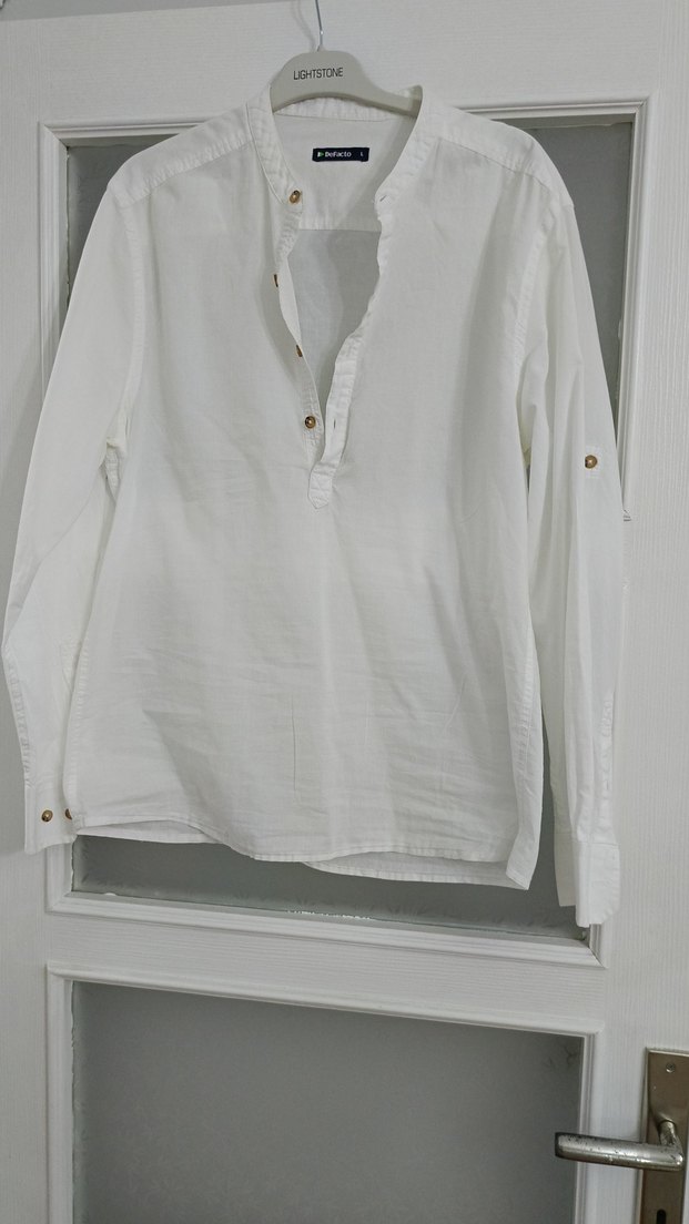 Düğmeli önü, uzun kollu, yakalı beyaz keten gömlek. Salaş kesimi ve minimalist bohem tarzıyla günlük kullanıma uygundur.