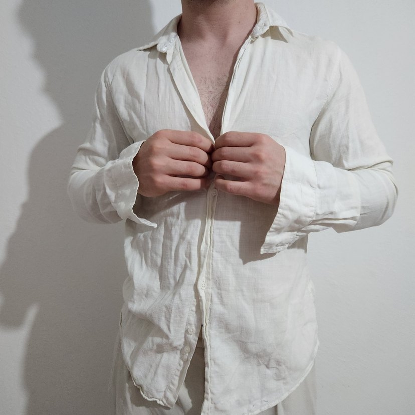 Düğmeli, keten kumaştan beyaz, uzun kollu ve normal boyda, minimal ve sade tasarıma sahip erkek gömleği. Hiçbir kusuru, lekesi veya deformasyonu yoktur. Bedenle tam uyumludur, kumaşı oldukça kalitelidir.