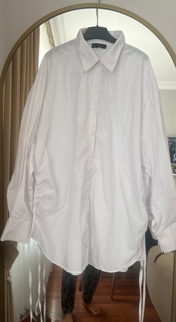 Düğmeli beyaz keten gömlek, yakalı ve uzun kollu, bol kesimdir. Ofis kullanımı için uygun, rahat ve şık bir görünüm sunar. Yanları bağcıklı