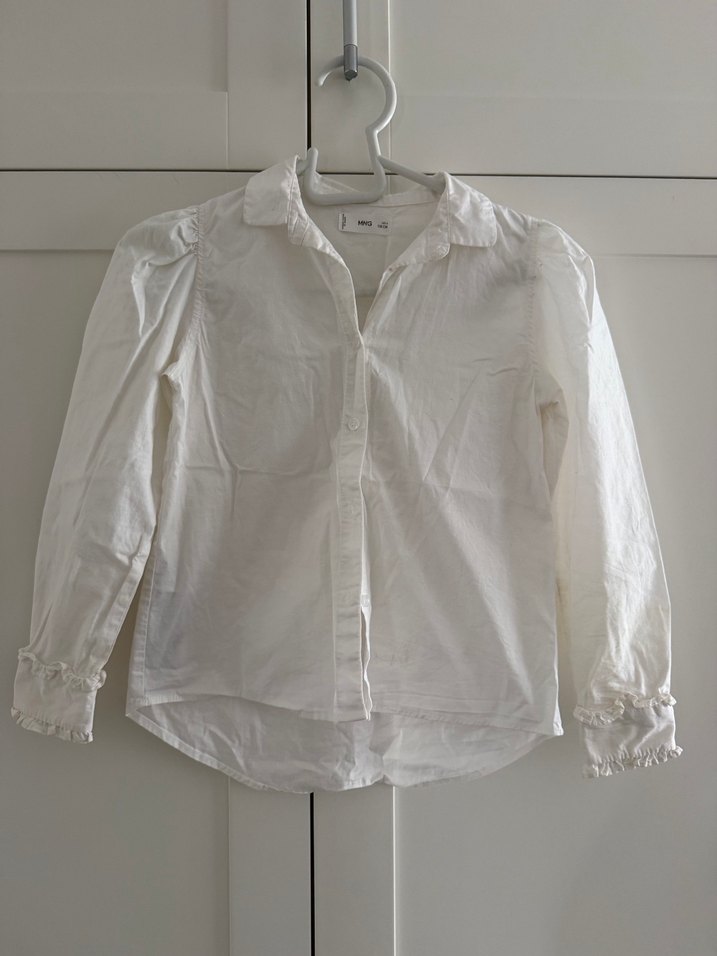 Uzun kollu, yakalı ve düğmeli beyaz keten gömlek. Normal boyda, salaş kesim, minimalist ve sade tarzda, ofis kullanımı için uygun. 8 yas yazıyor ama 6 yas uyumludur