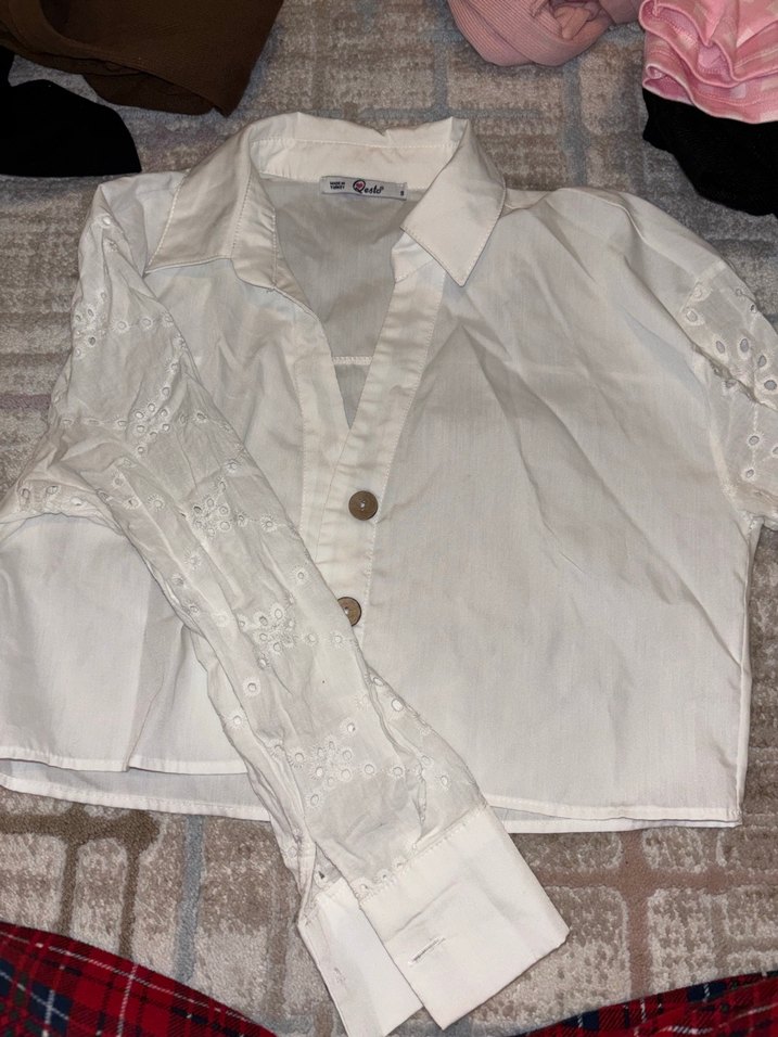 Düğmeli, uzun kollu, keten kumaştan beyaz gömlek. Salaş kesim ve yakalı tasarım, kol kısmında hafif nakış detayları bulunur. Bohem stil için uygun.