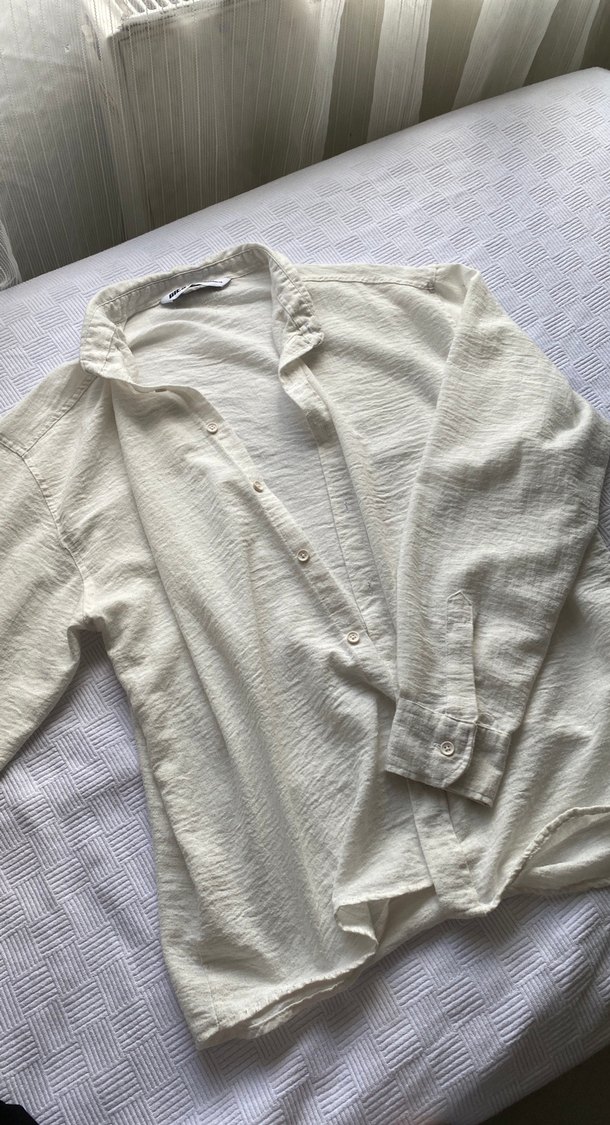 Beyaz keten kumaştan, düğmeli, geniş kesim uzun kollu ve yakalı kadın gömleği. Minimalist ve sade tasarımıyla günlük kullanıma uygundur.
