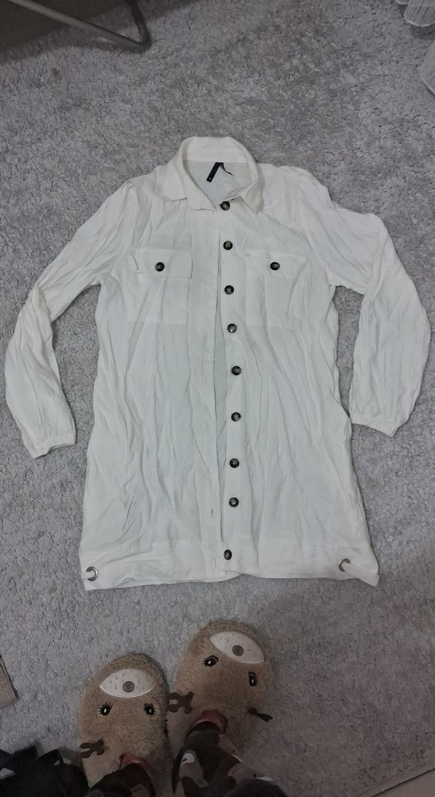 Beyaz keten gömlek, uzun kollu ve düğmeli. Yaka detaylı, bol kesim ve iki ön cepli, günlük rahat sokak stili için uygun. etiketsiz sıfırdır. tesettür giyime de uygundur. 38 beden