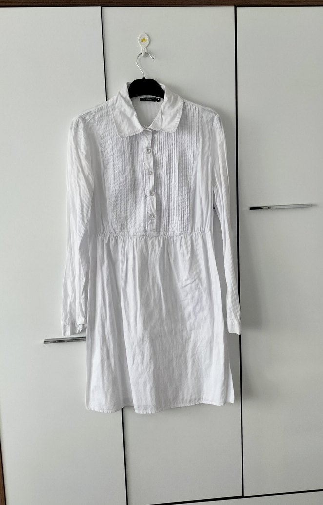 Düğmeli, uzun kollu, beyaz keten tunik yakalı, günlük kullanıma uygun minimal tasarım.