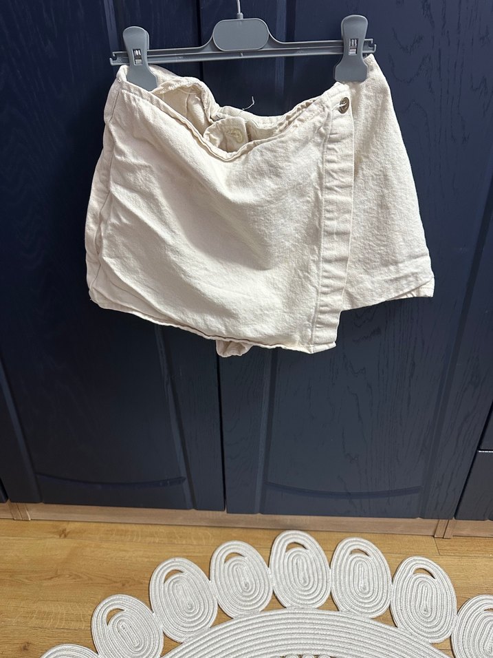 Düğmeli ön kısmı ve kısa kesimiyle, bol kesim beyaz keten şortu, günlük kullanım için sade tasarıma sahiptir. Ön kısmında belirsiz bir leke vardır