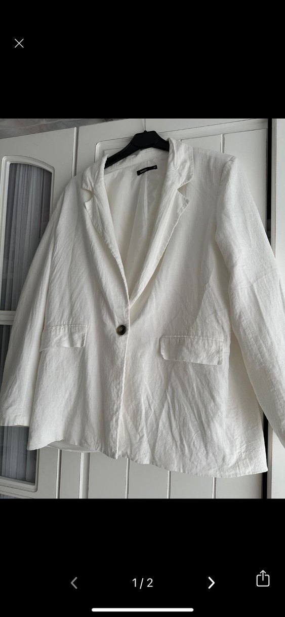 Düğmeli, keten kumaştan yapılmış beyaz blazer. Normal boyda, notched yaka ve uzun kolludur. Ofis için uygun, sade ve bohem tarzda.