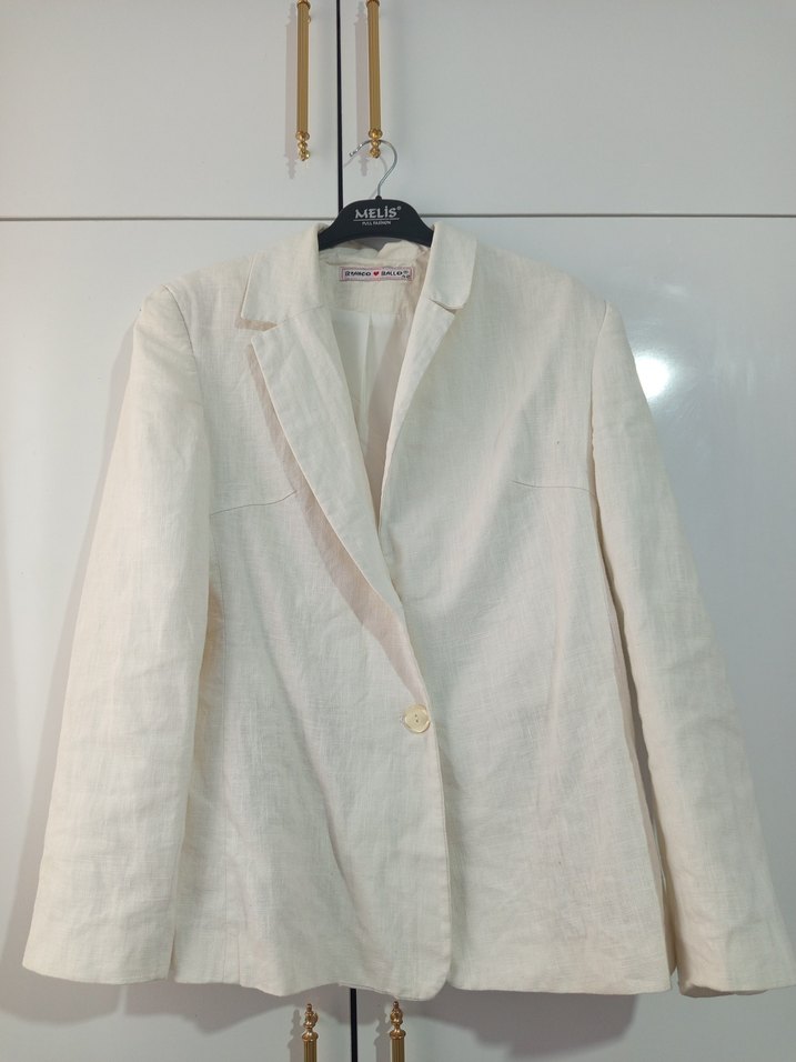 Düğmeli önü ve kırık yakası olan beyaz keten blazer. Normal kalıp ve uzun kolludur, ofis için uygun sade ve desensiz tasarıma sahiptir.