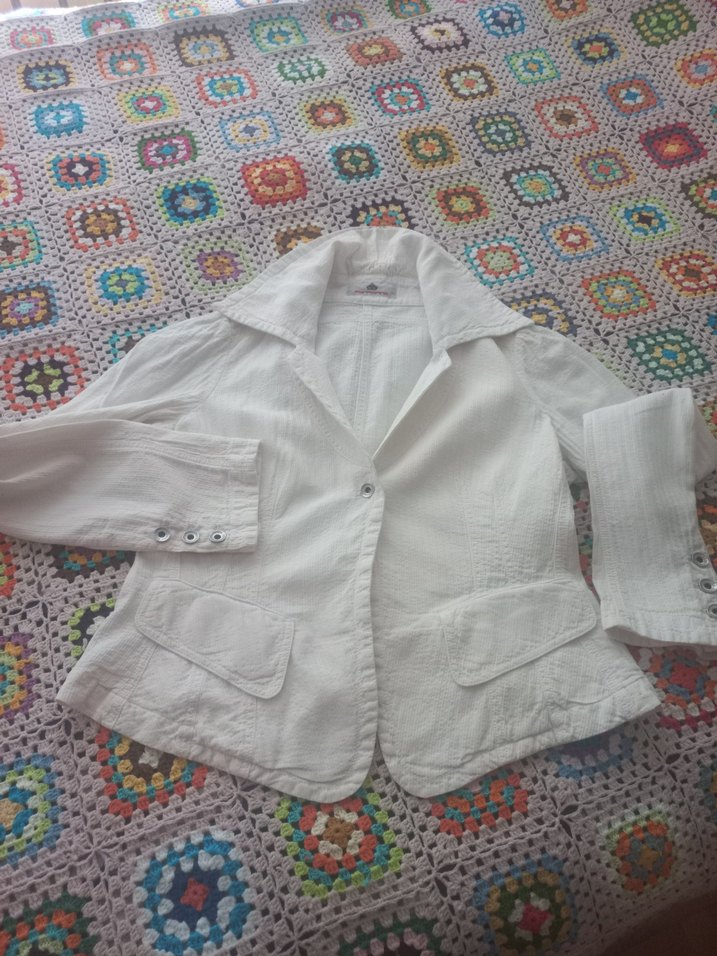 Beyaz keten kumaştan yapılmış, düğmeli, uzun kollu ve kesikli yakalı kadın blazer. midi boyda, bohem tarzda günlük kullanıma uygun.