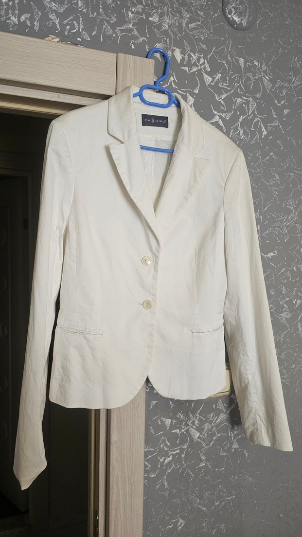 Ekru beyazı keten kumaştan yapılmış, düğmeli, uzun kollu ve normal midi boyda kadın blazer ceket. Ofis ve günlük kullanıma uygundur. Ütü yapılmalıdır.