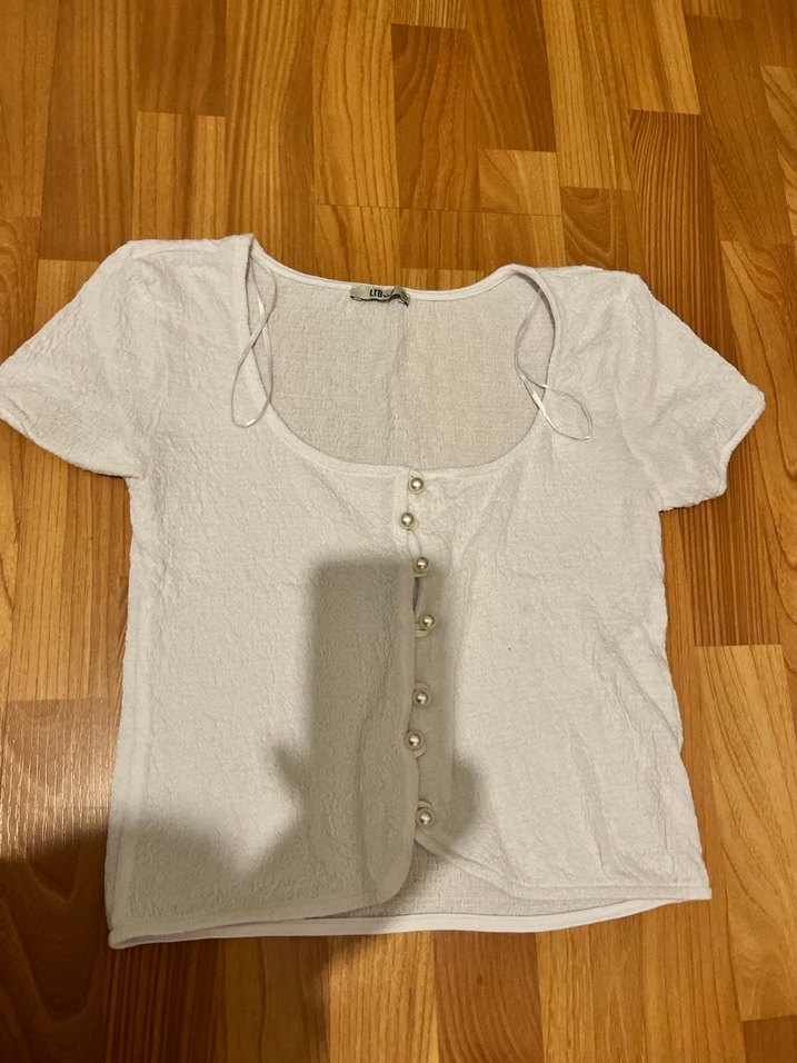 Düğmeli, kısa kollu, bisiklet yaka beyaz keten kumaştan yapılmış, normal boyda ve vücuda oturan kadın bluz. Rahat ve trend sokak tarzına uygun.