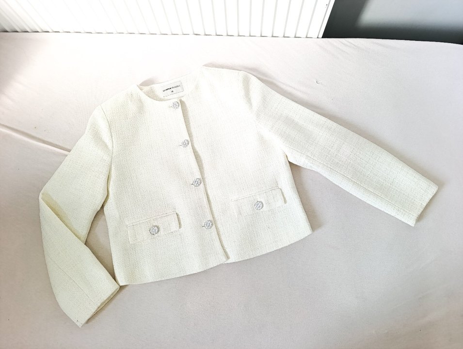 Düğmeli beyaz keten kadın ceket, klasik modern tarzda, kısa ve regular fit kesimlidir. Uzun kollu ve yakası kesiklidir, günlük kullanıma uygundur. LCW 40 Beden (38 Uyumlu) Krema Tweed Ceket ✨ Sadece 1 kez giyildi, kusursuz/yeni gibi. Krema rengi, yuvarlak yaka, taş detaylı şık düğmeli. Dar kalıp 38 bedene ideal. Ofis ve özel günler için zamansız bir parça.