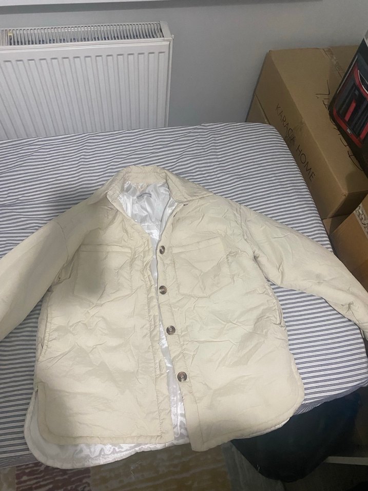 Düğmeli, keten kumaştan, beyaz renkli, normal uzunlukta ve midi kesim kadın ceket. Yağmurluk ve mesimlik olarak kullanılabilir