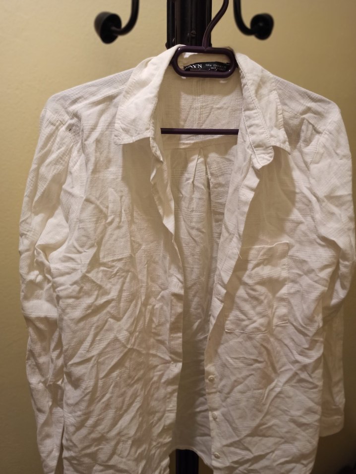 Beyaz keten kumaştan, düğmeli ve yakalı, uzun kollu, bol kesim kadın gömleği. Minimalist ve sade tasarımıyla günlük kullanıma uygundur.
