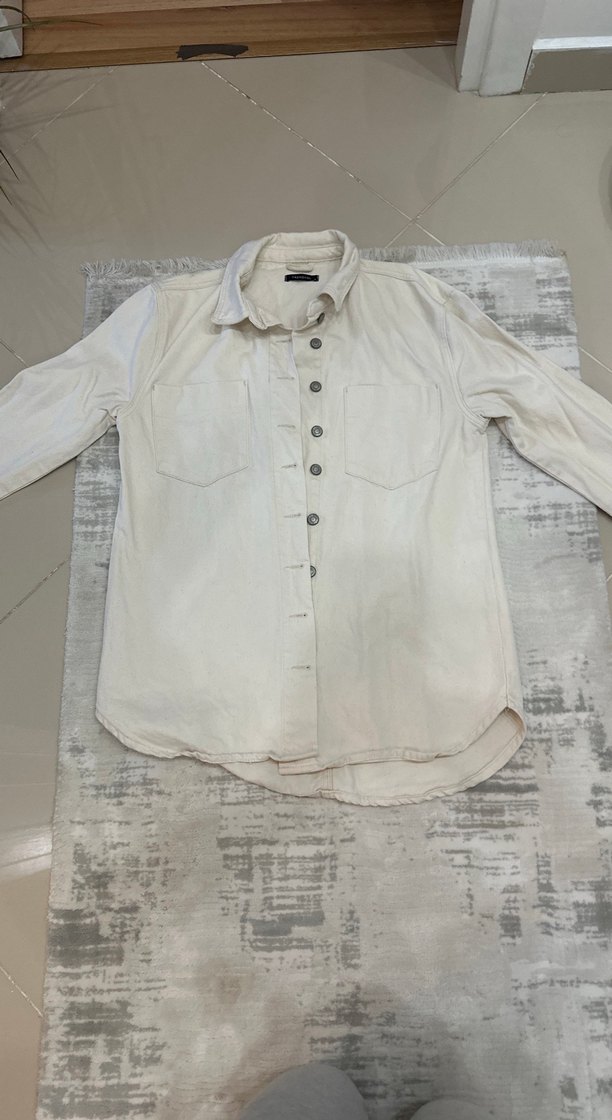 Uzun kollu, düğmeli beyaz keten gömlek, yakalı ve bol kesimdir. Günlük rahat sokak stili için uygundur.