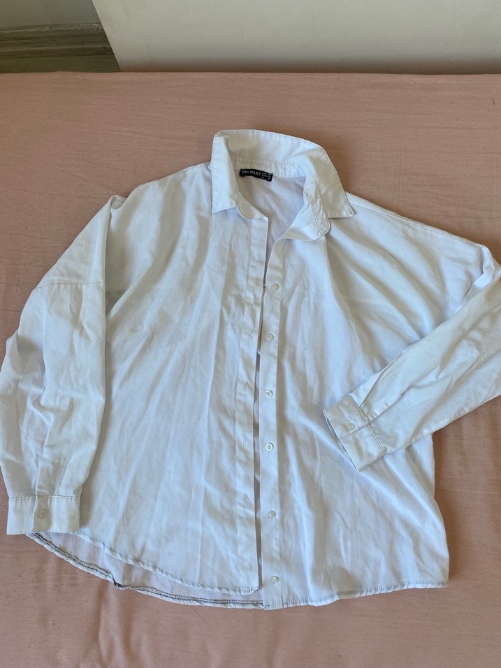 Düğmeli beyaz keten gömlek, yakalı ve uzun kollu, rahat kesimlidir. Minimalist ve sade tasarımıyla günlük kullanıma uygundur. OVERSİZE dir