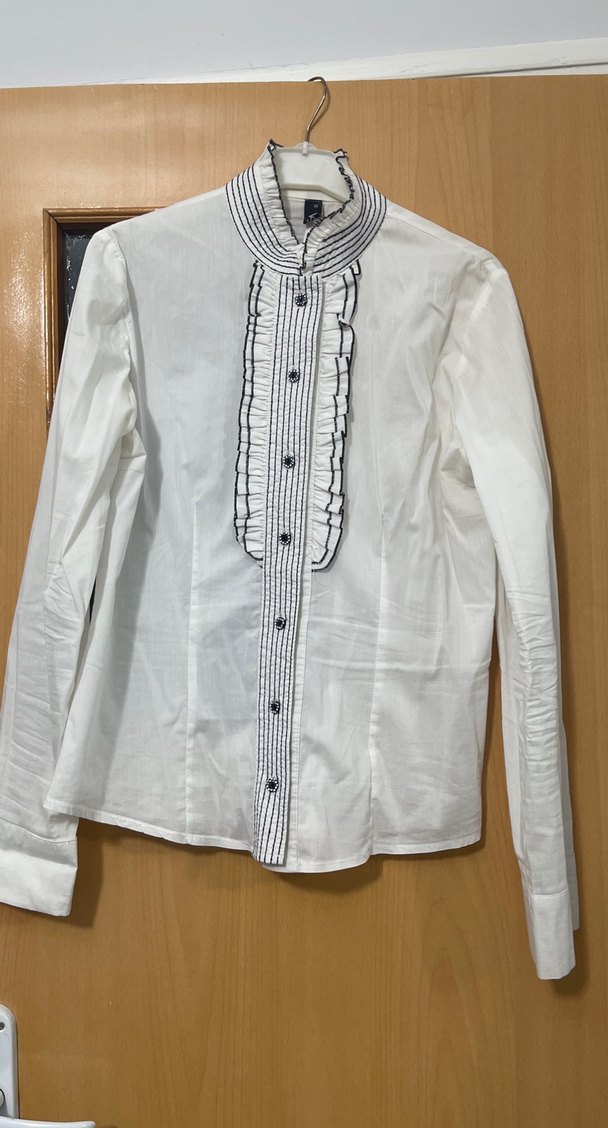 Uzun kollu, düğmeli, yakalı beyaz keten kadın gömleği. Nakış detaylı, normal boy ve regular fit, ofis için uygun.