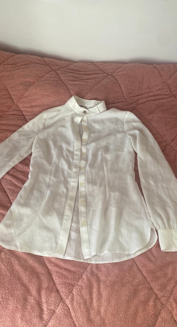 Düğmeli önü, uzun kollu ve yakalı beyaz keten kadın gömleği. Normal boy, regular fit ve minimalist normcore tarzda, günlük kullanıma uygun.