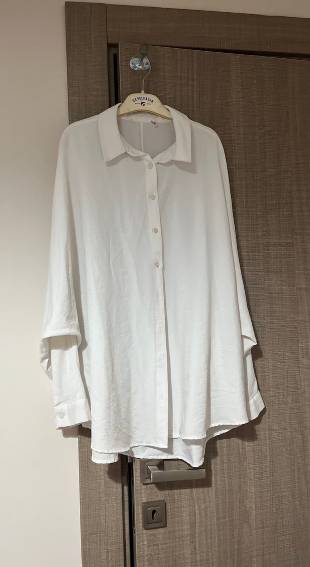 Uzun kollu, düğmeli, yakalı beyaz keten gömlek. Minimalist, desensiz ve rahat kesim, günlük kullanım için uygundur. Yarasa kol kumaşı yumuşak kumaş 2 kez giyildi deformesi yoktur bedeni olmadığı için satıyorum